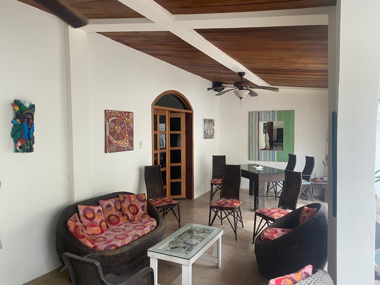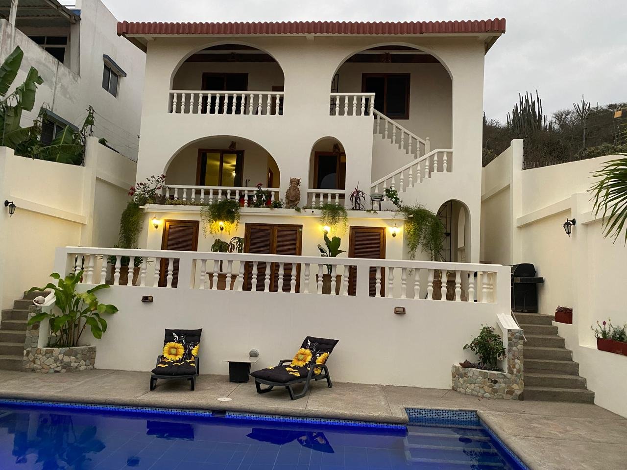 Located in the community of Puerto Cayo, 1 hour south of Manta, this Mediterranean-style house, twice featured on House Hunters International, is comprised of two buildings separated by a swimming pool. The front house boasts covered patios front and back and contains an open concept, spacious kitchen, dining area, living room and bathroom (approx. 1000 ft2). Both patios have their own dining area and the back patio features a built-in gas barbecue with a large grilling area. The kitchen features a gas stove and oven, two large capacity refrigerators, and one chest freezer. The back house has 4 bedrooms and 4 bathrooms, all ensuites, 12 x14′, as well as a studio apartment, laundry room, tool shed and pool house. Ceiling fans are located throughout as well as air conditioning throughout.